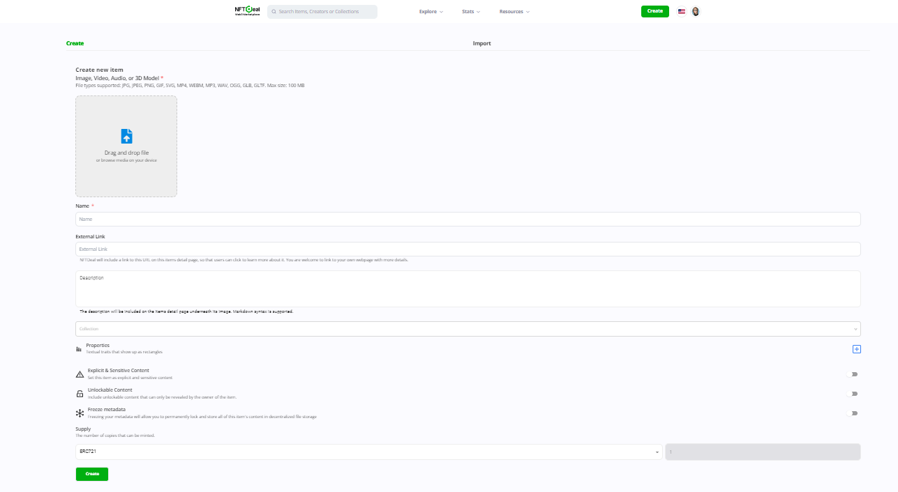 Before getting started, make sure you have connected your wallet to NFTDeal. Click on the **"Create"** button at the top right of the website. Now you will see the page to create and customize your NFT.
