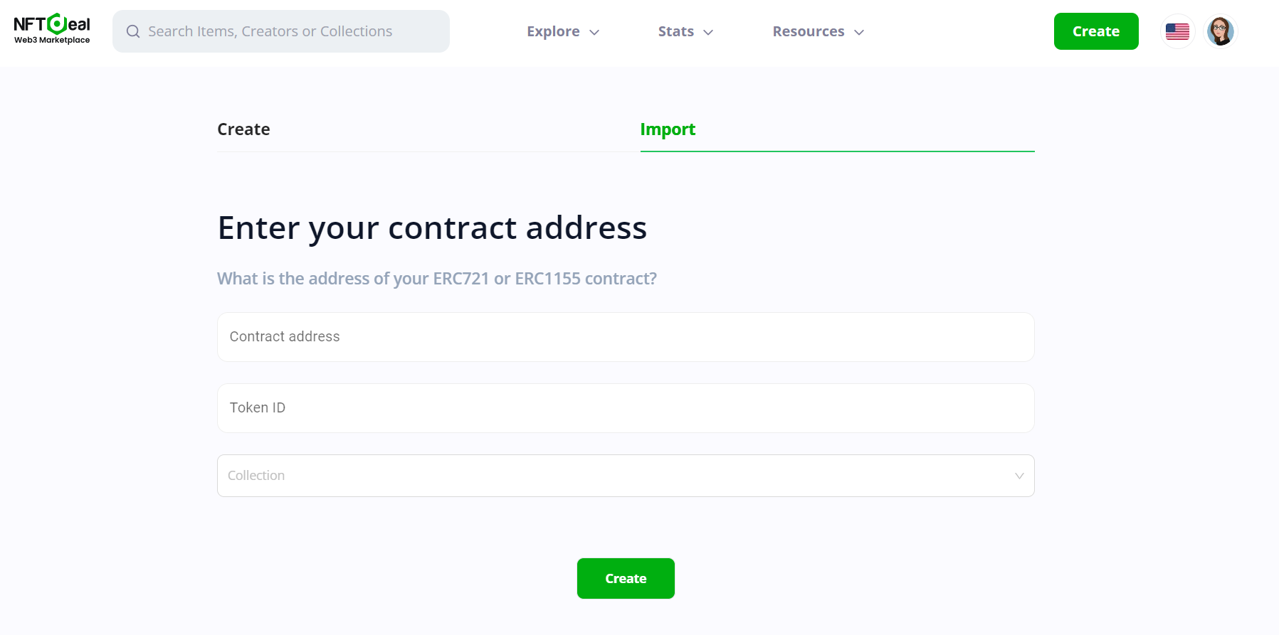 Enter the contract address, token ID, and select the collection you want to create. Then click the Create button.